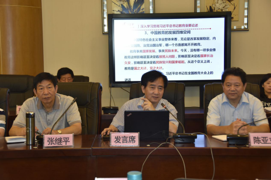2020年9月7日,我校迎来新学年开学季,下午1:30党委召开中心组扩大学习会议,全体党委委员和中层干部参加了中心组学习,党委书记黄晞建作专题报告,进一步深入学习习近平总书记教育重要论述,推动学校思想政治教育工作和教育改革创新稳步发展;党委副书记、校长冯伟国和震旦教育集团创始人、震旦教育发展基金会理事长、党委委员张惠莉分别讲话,会议由党委副书记夏臻主持。 会上,黄晞建书记深入宣讲了习近平总书记教育重要论述,并从战略全局角度阐释了“教育始终联系中华民族伟大复兴”的重要意义,强调当今世界教育的基础性、先导性、全局性地位和作用,从教育内涵角度科学论述了教育改革发展的新理念新思想新观点,教师扎实学识、立德树人的使命担当,学生扎根人民、奉献国家的理想信念,并对党政负责干部提出了熟悉教育、关心教育、研究教育的要求。