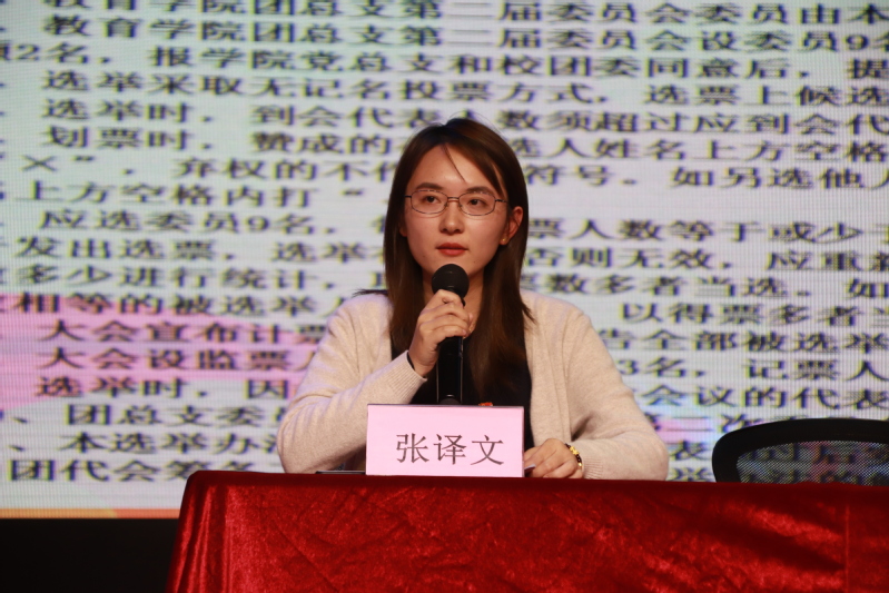 张译文老师宣读《教育学院团总支第二届委员会委员选举办法》,并经举手表决,一致通过。