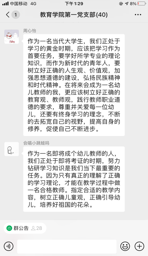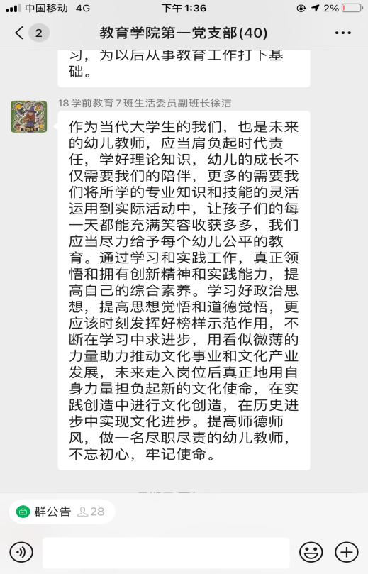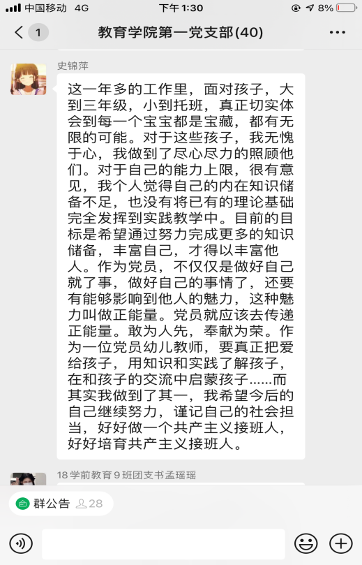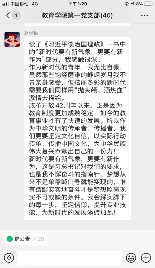 教育学院党总支于2020年10月14日中午12时在学院图书室开展了“学习治国理政思想,牢记立德树人使命”主题党日活动。教育学院党总支全体党员通过线上和线下两种形式参加。此次专题学习会由教育学院党总支副书记杨彦琛同志主持。 活动开始,党总支副书记杨彦琛同志带领全体党员认真学习《习近平谈治国理政》第三卷第一章节“谱写新时代中国特色社会主义新篇章”。大家围绕坚定文化自信,作为大学生党员、党员教师、幼儿教师,我们应该怎么做;新时代要有新气象,更要有新作为,作为青年人我们应该在“两个一百年”的历史交汇期能做些什么两个主题并结合自己的学习体会进行了研讨交流。 会上,党员代表吴昊一和王久清两位同志分别代表老师和学生做了学习《习近平谈治国理政》第三卷(节选)的学习汇报。 这么多年来党的一些方针政策以及宣传,一直都在不断的帮助大家树立正确的价值观、世界观,在学习强国的学习中也在不断的体会中国社会主义建设的历程,感受中国的发展,为是中国人而感到骄傲。尤其今年的疫情更对国际政治,国际关系有了更深层的了解。其实立足工作,我们也同样的需要树立正确的价值观,保持对工作的初心和热情,认真做好自己的本职工作,知行合一。 -------教师党员 吴昊一 作为人民教师,我们“胸怀两个大局,做好自己的事情”,把“人民至上”作为工作的标准,用耐心、爱心陪伴幼儿,让幼儿在安全的环境下,形成好的学习习惯、生活习惯;设身处地站在家长的角度,分析问题,运用自己的专业知识答疑解惑,做好家园合作,为建设新时代中国特色社会主义而不懈努力奋斗。 -------学生党员 王久清 最后,党总支副书记杨彦琛作总结讲话,要求大家要读原著、学原文、悟原理,开展交流研讨、撰写体会文章,组织教师集体学习、集体研讨、集体备课,先学一步、深学一层,用习近平新时代中国特色社会主义思想和党的最新理论成果充实完善教学讲稿、教学方案。 |