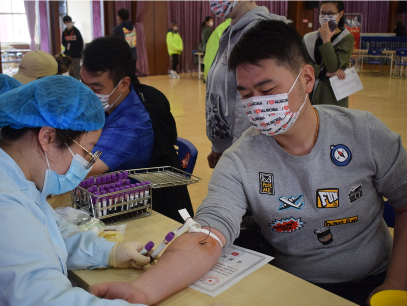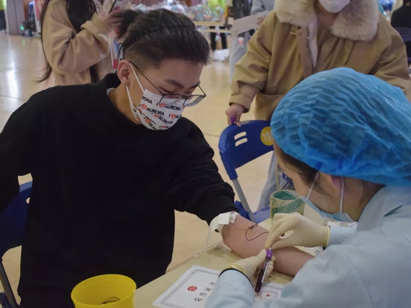 活动从上午9点持续到下午2点,前来入库的同学们统一有序地戴好口罩、测量体温、出示绿色随申码,在工作人员耐心细致地指导下领取表格,进行信息登记。信息核对通过后,有间隔地排队采集6-8ml血液样本完成入库,领取荣誉证书。