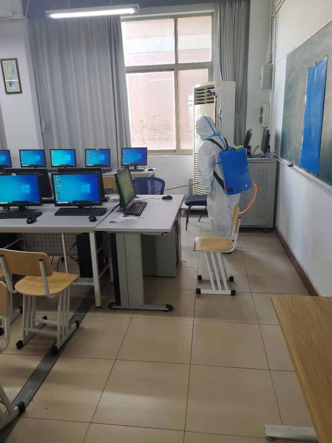 2020年是特殊的一年,虽然因疫情延迟了开学的时间,但是震旦校园里依然有一群人,每天在忙碌地工作,他们就是后勤的全体员工。2020年2月初,震旦教育集团董事长张沈在家中通过视频向全校安排疫情防控任务,进一步细化、明确开学前后的疫情防控及消毒工作。后勤处迅速组建了一支高效的消毒防疫队伍,日以继夜奋战在一线,用自己的血肉身躯站在学校防控疫情的最前沿,他们肩负着守卫师生生命安全和身体健康的重任,他们用“冲锋在前、奋力拼搏”的抗疫力量,为校园筑起了坚固的“防护堡垒”。他们在校门口搭建防疫通道、红外线测温仪、消毒区和临时隔离棚,严格把好第一道门;对教室、寝室、餐厅、办公室、厕所、电梯、体育馆等全面消毒,确保无遗漏、无死角。