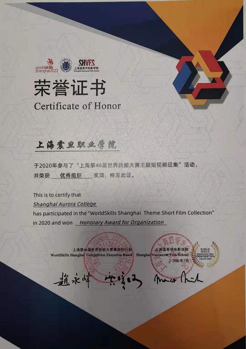 近日,我校在上海第46届世界技能大赛主题短视频征集活动中荣获“优秀组织奖”,东方电影学院杜闻、陶楠两位老师获“优秀指导老师”奖。
