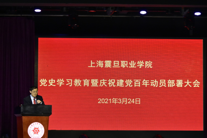2021年3月24日,上海震旦职业学院在大礼堂召开了党史学习教育和建党100周年动员大会,动员全校各级党组织和广大党员学党史、悟思想、办实事、开新局。校党委书记黄晞建、校长冯伟国、党委副书记夏臻,以及各党总支书记和直属支部书记、全体师生党员和教职员工参加了大会,会议由冯伟国主持。