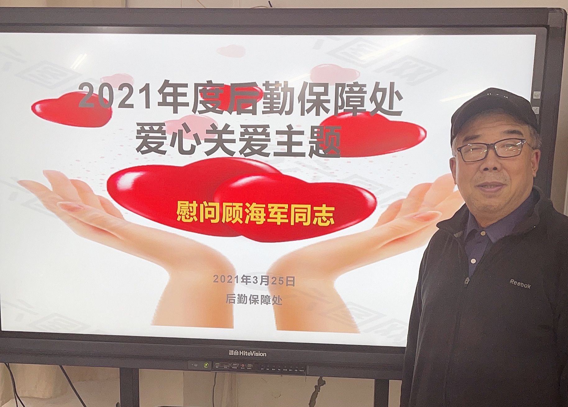 此次座谈会是关于慰问后勤保障处老员工顾海军。顾海军在2020-2021学年第一学期期末时,患上严重眼疾,但他心系工作,没有把病情告诉任何人,直到放寒假,才去做了眼部手术。