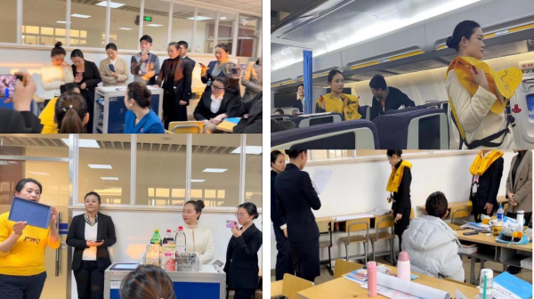 本次培训采用“理论+实践”的培训模式。理论知识培训涵盖空中乘务专业1+X政策解读、中国民航发展史与乘务员教育思路、民航法介绍以及沟通技巧等模块,有助于空乘专业的内涵建设,尤其是积极利用社会优质资源来提升、完善空乘学生实训教学环境。实践环节更加贴近实际,如模拟舱服务、乘务职业形象、特殊旅客服务、模拟北京至上海航线服务程序、求生技巧等环节,帮助老师更好地掌握民航空乘的专业技能。