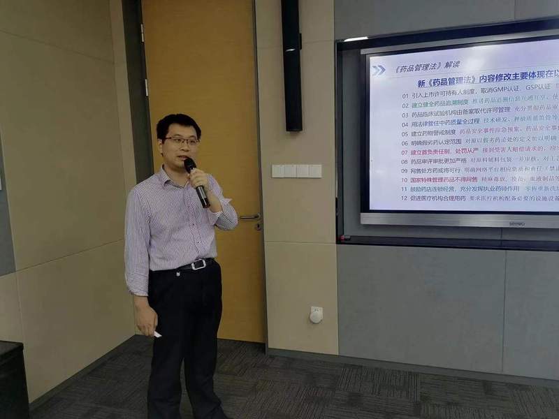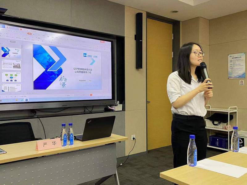 首先,上药控股质量管理部严华老师带着同学们解读了《药品质量管理法》,并要求学生贯彻落实好四个最严要求。同时,严老师还从《药品经营管理条例》、质量管理部门介绍、质量管理体系介绍三个方面为同学们进行了细致讲解。