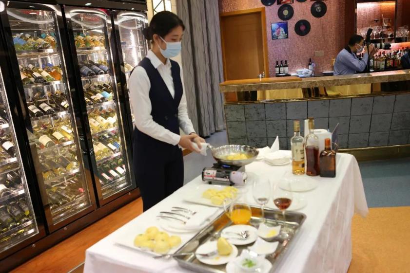 图为学生参加上海市“星光计划”大赛餐饮服务项目总决赛 学院酒店管理专业自2017年成立以来,第一次参加市级比赛,比赛面临时间紧、任务重的困难,学院高度重视,鼓励年轻教师不畏困难、勇往直前,有经验的教师乘风破浪带队参赛。比赛备赛期间,更是得到学校各级领导的支持,大到备赛场地的批准,小到一块拖线板的购置,都能尽快落实到位,使得同学们可以有稳定的备赛场地,有充裕的备赛物资,有充足的备赛时间。 本次比赛项目主要是运用丰富的国际美食和服务等方面的专业知识,依据服务规范以及比赛要求完成咖啡制作、鸡尾酒调制、水果拼盘制作、菜肴烹制、餐前准备等比赛内容,然后运用娴熟的服务技能、有效的沟通技巧、良好的礼仪举止为客人提供优质餐饮服务的竞赛项目。指导老师周燕萍、包一芳在集中备赛环节现场教学,亲自示范,并手把手教学,同时模拟现实餐饮服务环境,克服学生餐饮项目实操的短板,并为了模拟比赛环境,带领同学们到兄弟院校,进行比赛环境的体验。