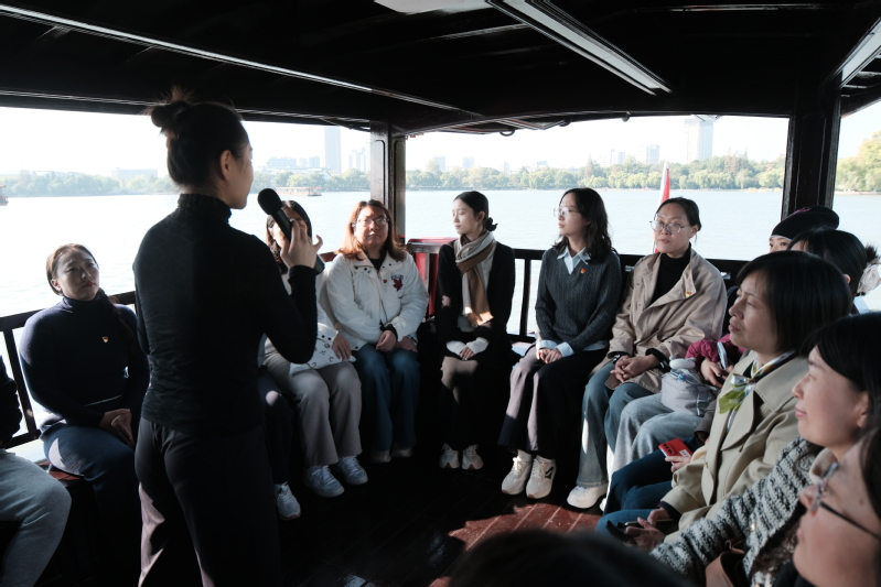 当日,党员同志们乘坐Y701红色专列奔赴嘉兴,在会景园码头登船远眺。在船上,教师党支部书记高敏老师以“南湖的回响”为题,带来了一场简短而深刻的微党课。她结合党史故事与新时代使命,生动阐释了“开天辟地、敢为人先的首创精神,坚定理想、百折不挠的奋斗精神,立党为公、忠诚为民的奉献精神”的核心内涵。全体党员围坐船头,沉浸式参与“水上课堂”,接受了一次深刻的思想淬炼。