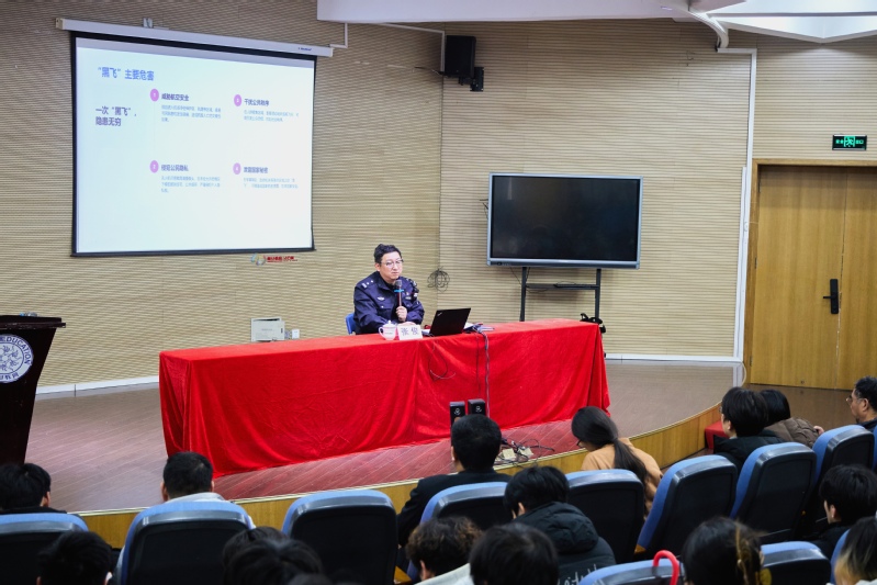 宣讲会上,张俊副所长首先从当前无人机应用普及与随之而来的监管挑战切入,介绍了公安机关开展无人机“黑飞”专项整治行动的背景,生动剖析了“黑飞”行为的危害。他指出,随着无人机技术的快速发展,无序、违规飞行现象日益增多,给国家安全、军事安全、公共安全及个人隐私带来严峻挑战。他呼吁广大师生,尤其是无人机爱好者,务必树立“空中交通”规则意识,主动学习相关法律法规,绝不可心存侥幸、以身试法。 随后,张俊副所长聚焦大学生群体高发的电信网络诈骗,结合派出所日常接报警情,梳理了当前几种主要的诈骗类型及防范策略。他提醒学生,切勿因蝇头小利出租、出借、出售自己的电话卡、银行卡、支付账号或为他人提供技术支持,“不轻信、不透露、不转账”,守住自己的“钱袋子”。