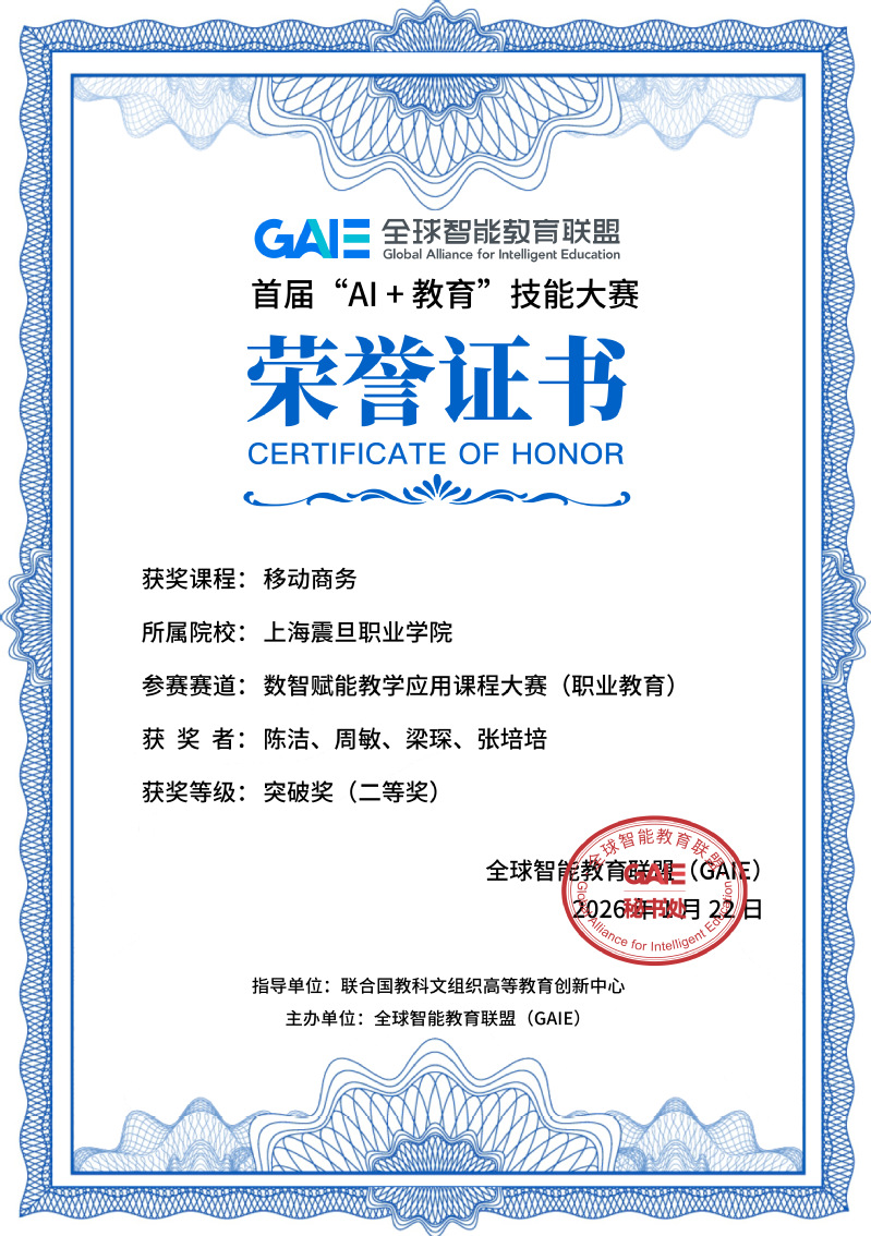 近日,由联合国教科文组织高等教育创新中心指导、全球智能教育联盟(GAIE)主办的首届GAIE“AI+教育”技能大赛决赛圆满落幕,我校经济管理学院陈洁、周敏、梁琛、张培培团队的《移动商务》课程在“数智赋能教学应用课程大赛”中脱颖而出,荣获职业教育组突破奖(二等奖),充分彰显了学校在数字化教学改革与高水平专业建设方面的突出成效。
